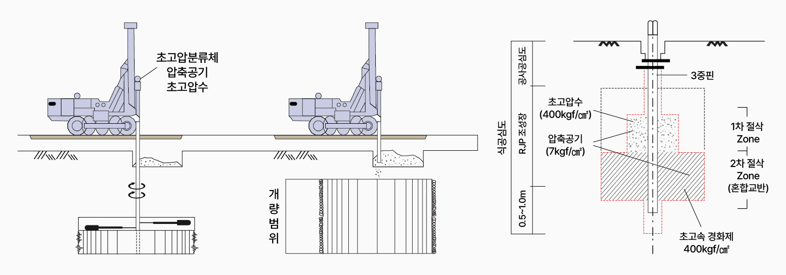 | 주입방식 | 3중관 ROD, 3개 노즐분사 (물 : 19.6 Mpa + AIR : 0.98~1.96 Mpa + 경화제 : 39.2 Mpa) |