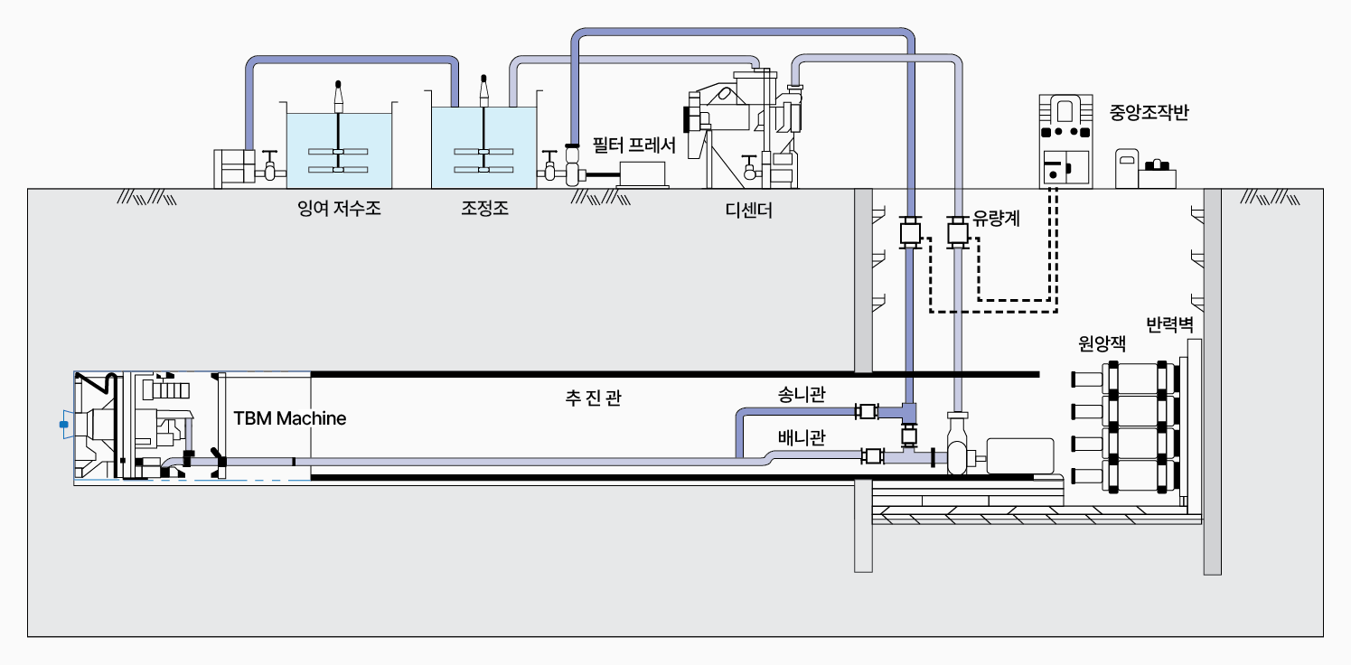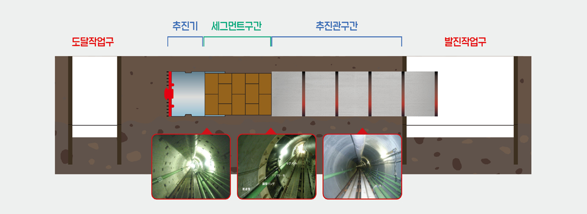 도심지역에 장거리 공사가 필요하고, 과밀한 도심지역에서는 철도 건널목, 중요 구조물의 하부등 어려운 조건이 요구되며, 최근에는 기후변화의 영향으로 게릴라 폭우에 대한 대책으로 대구경 빗물 저장로등의 구축이 시급해졌습니다. 이로인해, 장거리 공사 및 대구경 배관을 이용한 중요 구조물의 하부 횡단을 안전하고, 공기의 지연 없이 예상치 못한 환경에 대응할 수 있는 장거리 시공이 가능한 터널굴진장치(세미쉴드&쉴드)공법을 확립하였습니다.